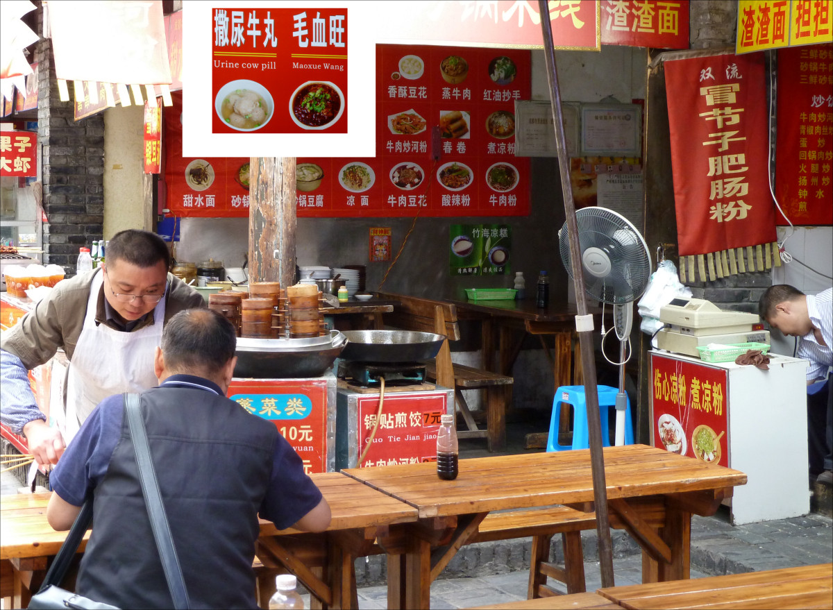 Which of their specialties (sign on the center post) would you dare to try: Urine Cow Pill or Maoxue Wang? Well, the former are just "juicy meatballs" without any bovine accidents. Maoxuewang is a Sichuan specialty and uses two types of tripe (= edible lining from cattle stomachs) as main ingredients.