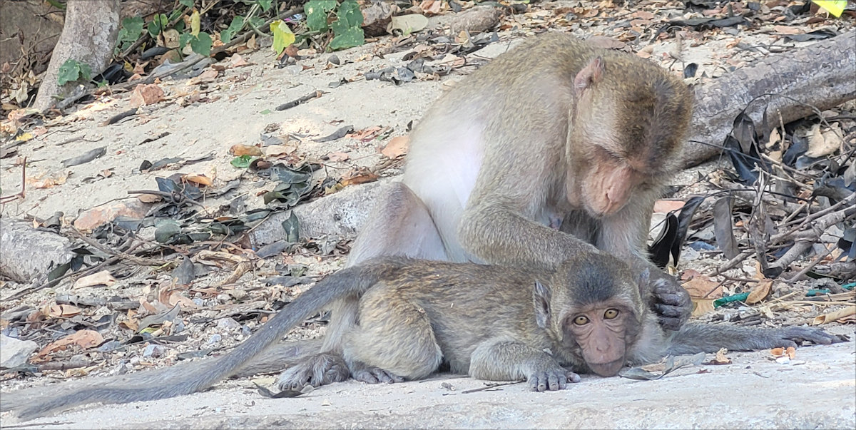 A double-tailed monkey? No, just one monkey picking the fleas—or whatever— from the tail of a buddy.