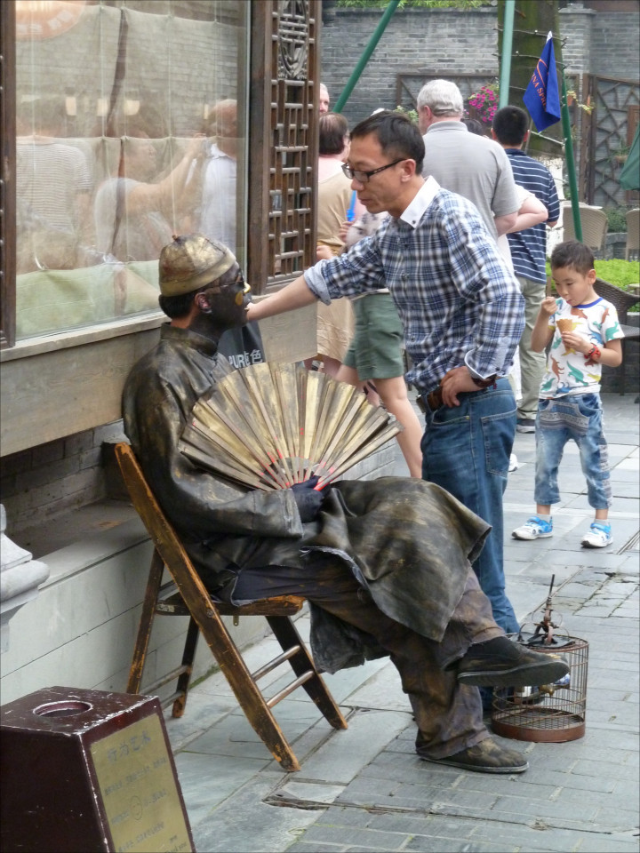 The face-changing performers switch from one face to another almost instantaneously with the swipe of a fan, a movement of the head, or wave of the hand. It can't be described; it must be seen. Have a quick look at the video He Hongqing, World's Fastest Mask Changer. That's the type of treat I was in for!