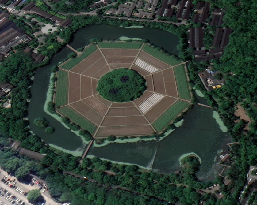 The next few pictures are all from Eight Diagrams Field (Bagua Tian), another one of my Hangzhou favorites! It's a huge field in the shape of an octagon and a complex philosophy of when to plant what. This screenshot from a Google Earth shows the entire area in relation to buildings and cars.